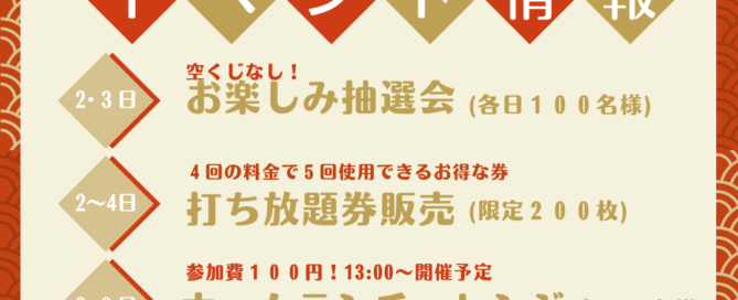 本年もどうぞよろしくお願い致します。 2026年お正月特別企画 楽しい事が盛りだくさんで、お待ちしております。 第一弾 おたのしみ抽選会(各日100名様) 2日(金)・3日(土)9:00~ カード入金されたお客様が対象となります。 杜の都ゴルフ倶楽部のプレイ券等々当たります。 各社たくさんの商品の協賛を頂きました。 第二弾 打ち放題券販売(限定200枚) 2日(金)~なくなり次第終了 [...]