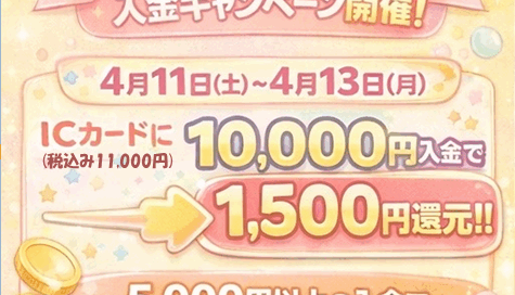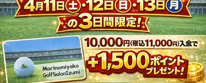 4/11(土)~4/13(月)の3日間限定✨ カードに入金するだけでポイントがどーんとアップ⛳ 10,000円(税込11,000円)入金 → +1,500ポイント 5,000円(税込5,500円)入金でも 15%ポイント還元 お得なこの機会をお見逃しなく!