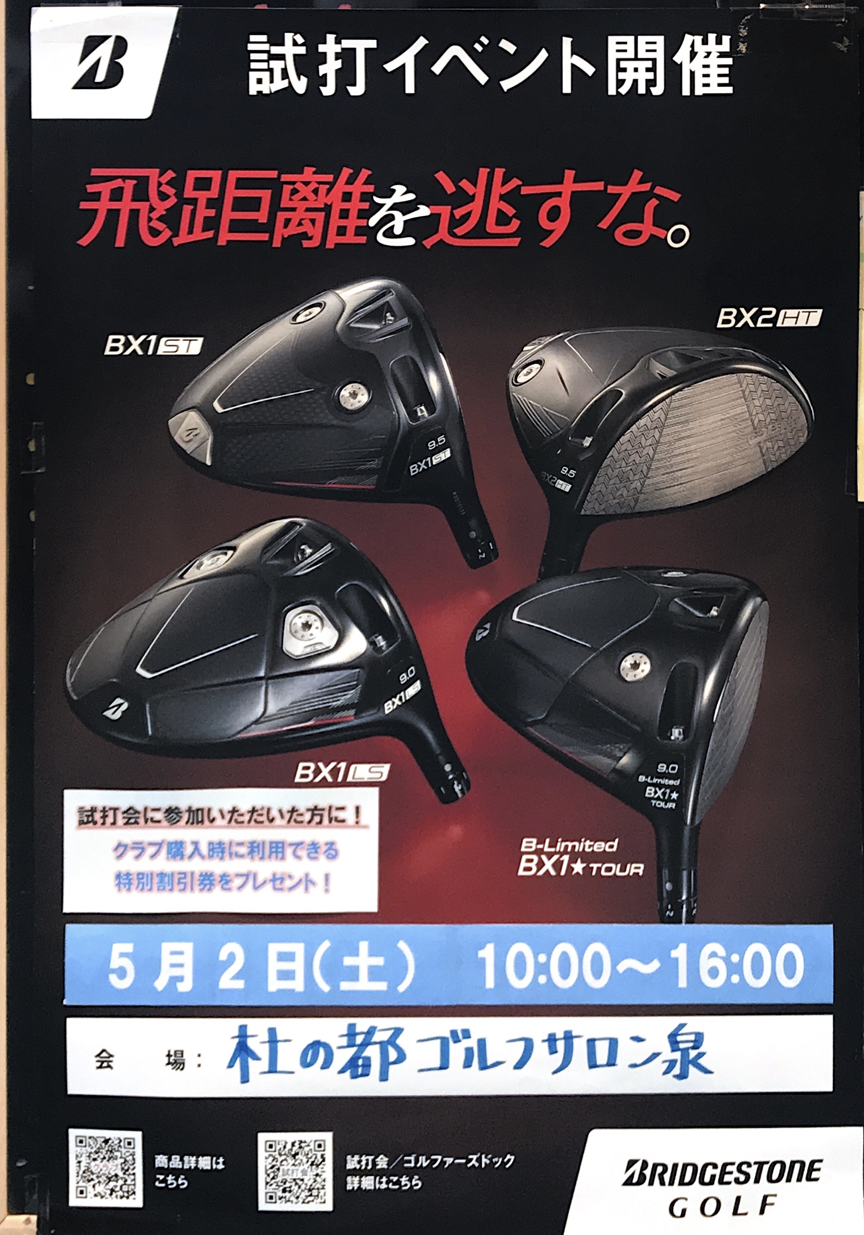 https://www.bsga.jp/sendaiizumi/golf-news/2026/03/8558 開催日 3月16日(月)15:00~20:00 NEWモデルBXシリーズを是非お試しください。フィッティングイベントも開催!フィッティング希望の方はご予約下さい。 ブリヂストンゴルフプラザ泉 022-371-0755