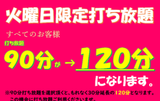 12月より『冬期感謝企画』開始いたします。 すべてのお客様対象で毎週火曜日90分打ち放題が、もれなく120分に!! 注:天候により中止になる場合がございます。 この機会に是非ご利用ください。