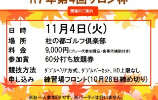 2025年09月25日 第4回サロン杯(11月4日開催) Gallery 第4回サロン杯(11月4日開催) イベント情報 第4回サロン杯(11月4日開催)杜の都ゴルフサロン泉2025-09-30T16:07:29+09:002025.09.25|Categories: イベント情報|0 CommentsRead More