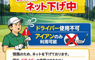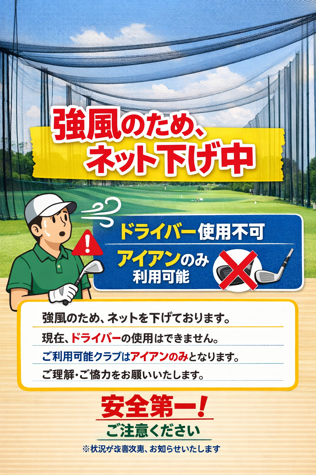 強風が収まり、ネットを通常の状態に戻しました。 現在はドライバーを含め、すべてのクラブがご利用可能です。 ご不便をおかけいたしましたが、引き続き皆様のご来場をお待ちしております。