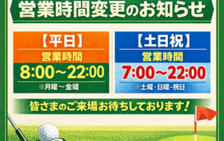 いつもご利用ありがとうございます! 4月1日より営業時間が変わります👇 ▶ 平日 8:00〜22:00 ▶ 土日祝 7:00〜22:00 朝早くからしっかり練習できるようになりました☀️ 出勤前のひと打ちにもぜひご利用ください! 皆さまのご来場をお待ちしております😊