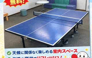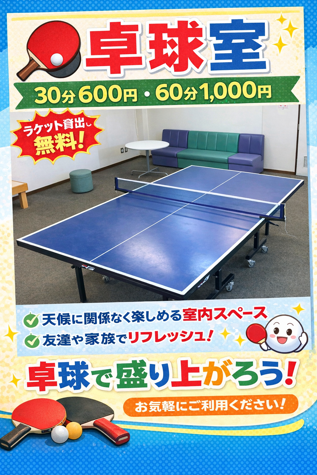 当ゴルフ練習場では、館内に卓球室をご用意しております。ご家族やご友人と気軽に卓球をお楽しみいただけます。 室内スペースのため、天候に関係なくご利用いただけます。ゴルフ練習の合間のリフレッシュにもおすすめです。初心者の方から卓球好きの方まで、どなたでもお気軽にご利用いただけます。 利用料金 ・30分 600円 ・60分 1,000円 ※ラケット貸出しあり 卓球室のご利用をご希望の方は、受付またはスタッフまでお気軽にお声がけください。皆さまのご利用をお待ちしております。